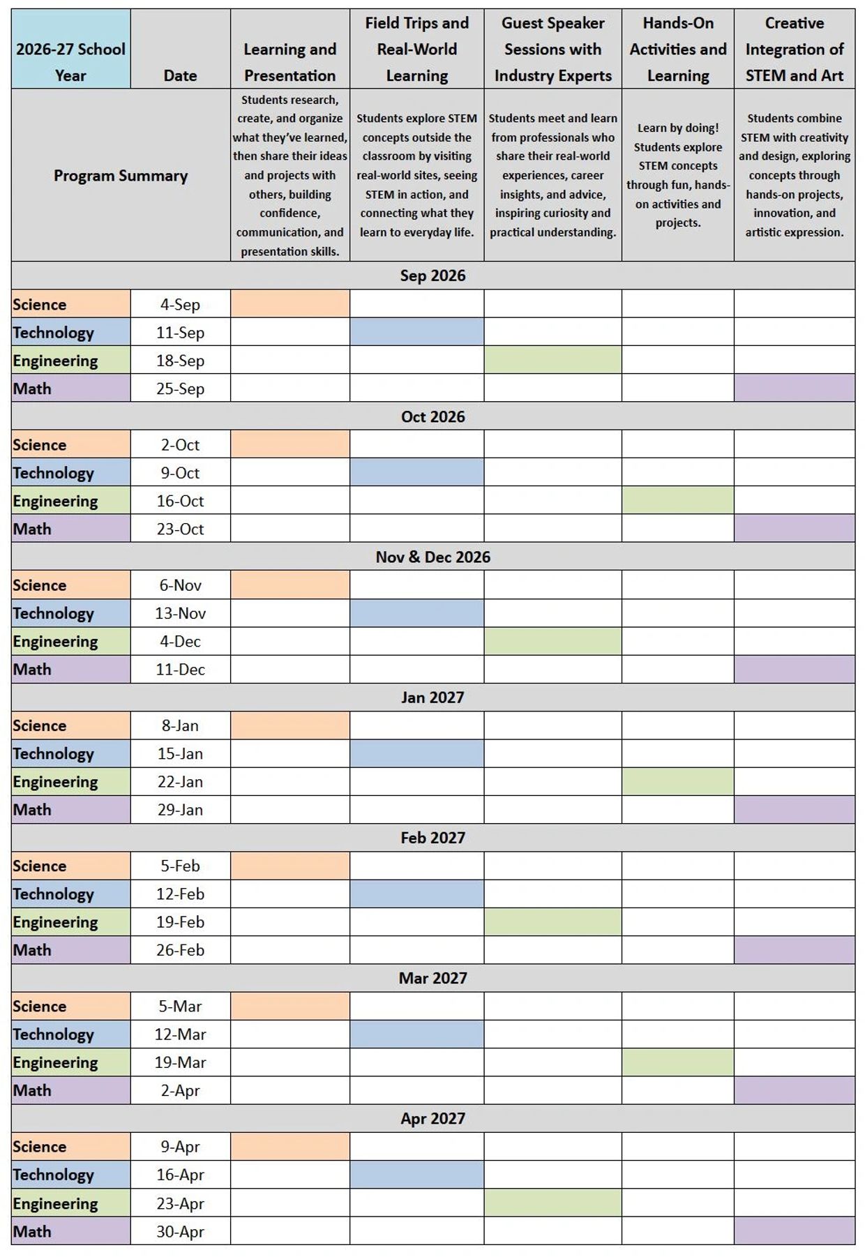 For the 2026–27 school year, 4C STEM Club offers weekly in-person STEM programs for students in 4th through 12th grade, running from September 2026 through April 2027. Every Friday between 5:00 PM and 7:00 PM, students participate in four programs each month—one focused on Science, Technology, Engineering, and Math (STEM).